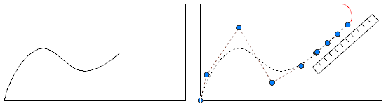 The tangent arrow grip changes the magnitude of the tangent at the base point, creating either a sharper or a flatter curvature at the base point. In the illustration, the magnitude of the tangent is being increased.