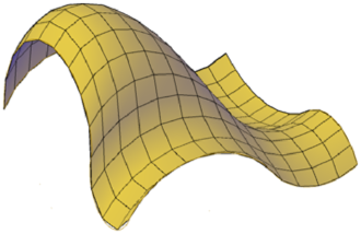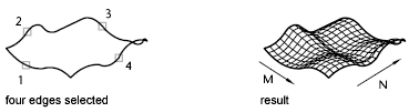 The mesh in the following illustration was derived from four objects called edges. Edges can be arcs, lines, polylines, splines, or elliptical arcs that form a closed loop and share endpoints. A Coons patch is a bicubic surface (one curve in the M direction and another in the N direction) interpolated between the four edges.
