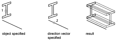 This method creates the mesh as a series of parallel polygons running along a specified path. The original object and the direction vector must already be drawn, as shown in the following illustrations.