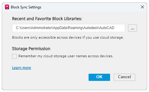 Controls the permission to remember the cloud storage user name across devices. Selecting this option provides a more personalized experience when accessing the recent and favorite blocks across devices.