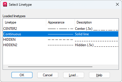 Displays the Load or Reload Linetypes dialog box, in which you can load selected linetypes into the drawing and add them to the list of linetypes.