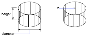 In the illustration, the cylinder was created using a center point (1), a point on the radius (2), and a point for the height (3). The base of the cylinder is always on a plane parallel with the workplane. You can control the smoothness of curved 3D solids, such as a cylinder, in a shaded or hidden visual style with the FACETRES system variable.