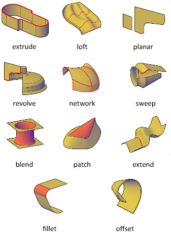 - Create surfaces from profiles. Create surfaces from profile shapes composed of lines and curves with EXTRUDE, LOFT, PLANESURF, REVOLVE, SURFNETWORK, and SWEEP.