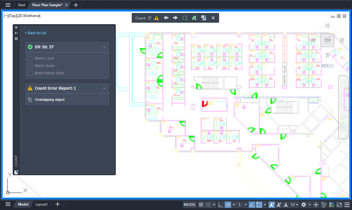The Count palette displays the block names and the corresponding count of each block. When you are in an active count, the Count palette displays count details including the error report, if any. The report lists the count errors such as overlapping, exploded, or renamed objects. Click the count error to zoom in and check the object.