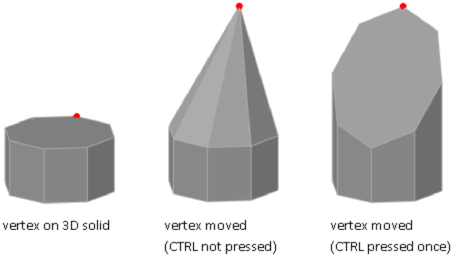You can modify the form of a 3D solid or surface by modifying one or more vertices. Use grips and gizmos, or run the 3DMOVE, 3DROTATE, or 3DSCALE command. When you scale or rotate vertices, you must select two or more vertices to see a change in the object. Clicking and dragging a vertex “stretches” the 3D object.