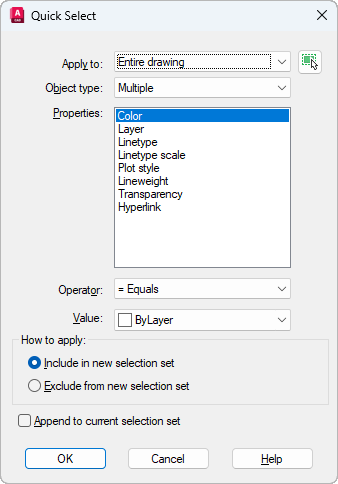 If Append to Current Selection Set is selected, the filtering criteria is applied to the entire drawing.