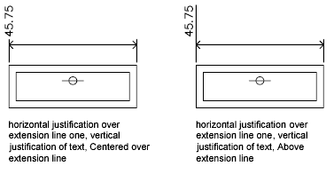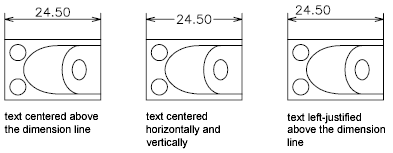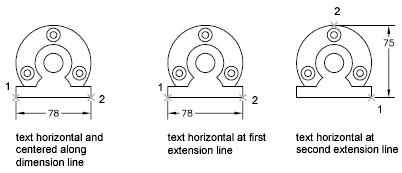 Other settings, such as Text Alignment, affect the vertical alignment of text. For example, if Horizontal Alignment is selected, text inside the extension lines and centered within the dimension line is horizontal, as shown in the leftmost illustration above. The text is horizontal even if the dimension line is not itself horizontal.