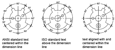 The position of the text relative to the dimension line is referred to as vertical text placement. Text can be placed above or below or centered within the dimension line. In the ANSI standards, centered text usually splits the dimension line. In the ISO standards, it is usually above or outside the dimension line. For example, ISO standards permit angular dimension text to appear in any of the ways shown.