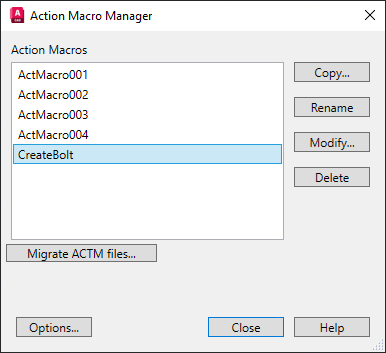 Your recorded action macro (ACTMX) files are listed in the Action Macro Manager.