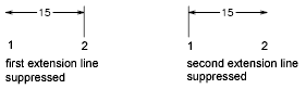 Suppresses the display of extension lines. Ext Line 1 suppresses the first extension line; Ext Line 2 suppresses the second extension line. (DIMSE1 and DIMSE2 system variables)