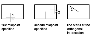 For example, you can use tracking to find the center point of a rectangle without using construction lines. Start tracking, and specify the midpoint of a horizontal line. Drag the cursor vertically and specify the midpoint of a vertical line (2). Press Enter to accept the point (3) at the center of the rectangle.