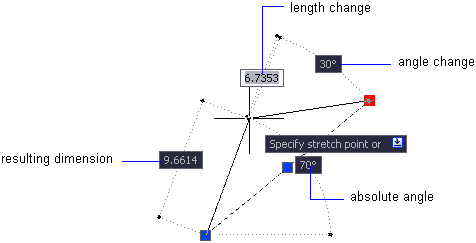 When you use grips to edit an object, the dimension input tooltip can display the following information: