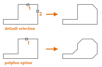 If the Trim option is enabled and two line segments of a polyline are selected, the chamfer or bevel added is joined with the polyline as a new line segment.