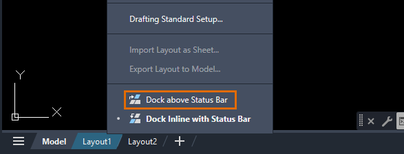 Right-click on the Model or Layout tab and select Dock Above Status Bar or Dock Inline with Status Bar.