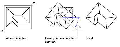 For example, you can rotate the plan view of a house by selecting the objects (1), specifying a base point (2), and specifying an angle of rotation by dragging to another point (3).