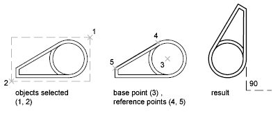 For example, to rotate the part in the illustration so the diagonal edge rotates to 90 degrees, you select the objects to be rotated (1, 2), specify the base point (3), and enter the Reference option. For the reference angle, specify the two endpoints of the diagonal line (4, 5). For the new angle, enter 90.
