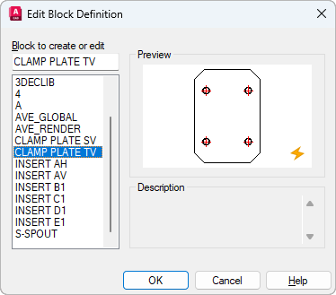 Displays a preview of the selected block definition. A lightning bolt icon indicates that the block is a dynamic block.