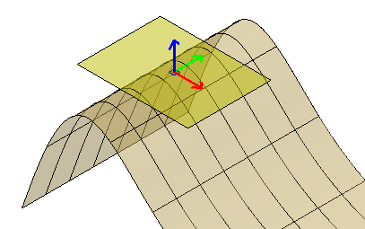 The illustration shows an imaginary UV plane in yellow that is tangent to the surface, and contains the base point. It displays the U axis in red, the V axis in green, and W axis, which is normal to the surface, in blue.