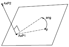 Rotates point p through an angle ang about the axis passing through points AxP1 and AxP2, as shown in the following example. The axis is oriented from the first point to the second point.
