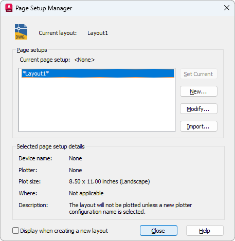 You can also create named page setups, modify existing ones, or import page setups from other drawings.
