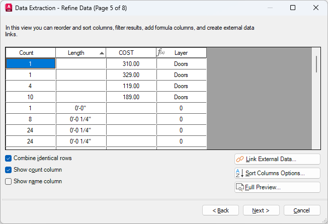 After you select the properties of the doors, the extracted data is displayed in the wizard in columns. You can organize and refine the information in these columns, and format it by specifying a table style or using an existing table as a template.