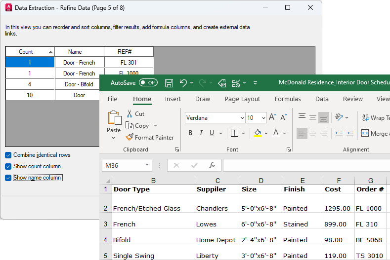 Information stored in an Excel spreadsheet can be linked and combined with the extracted drawing data (object property data). Continuing with the example above; you have some additional information about the doors in the your drawing in an Excel spreadsheet (supplier and cost). You select the columns for supplier and cost in the spreadsheet and combine them with the other data in the data extraction.
