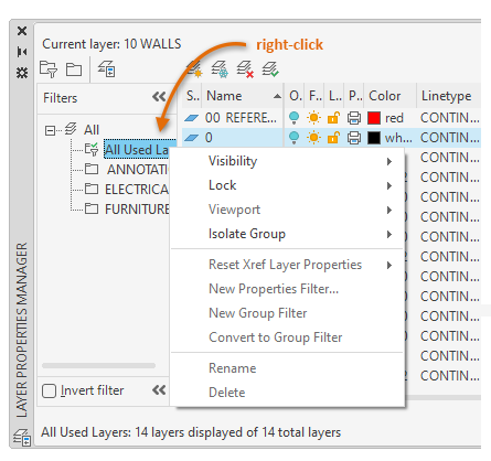 Removes the selected layer filter. You cannot delete the All, All Used Layers, or Xref layer filters.