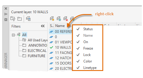Lists all columns by name. A check mark indicates that the column is included in the display. Click a column name to display or hide the column. VP Freeze, VP Color, VP Linetype, VP Lineweight, and VP Plot Style are available only when a layout viewport is active.