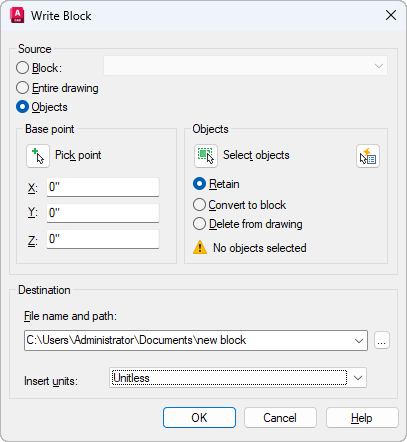 The Write Block dialog box provides a convenient method for saving part of the current drawing to a different drawing file, or saving a specified block definition as a separate drawing file.