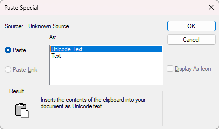 Inserts a picture of the application icon instead of the data. To view or edit the data, double-click the icon.