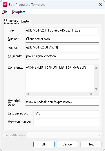 | @[block.attributeTag] | Extracts the attribute tag value from an attributed block and inserts it in the specified field.For example: inserting @[title.drawnby] in the Author field causes Propulate to search the drawing for an attributed block named title, extract the value of the drawnby attribute field, and insert that value in the Author field of the drawing's Drawing Properties dialog box. If common blocks are used across a project it is a simple matter to update a large number of drawings to reflect their specific attribute values. |