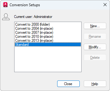 Renames a conversion setup that appears in the list. Only conversion setups that you have created can be renamed. The Standard conversion setup cannot be renamed.