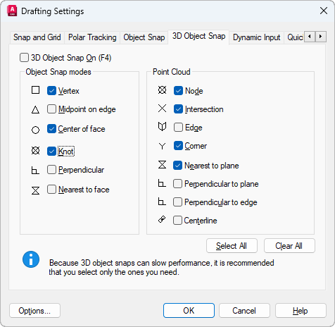 Controls running object snap settings for 3D objects and point cloud features.