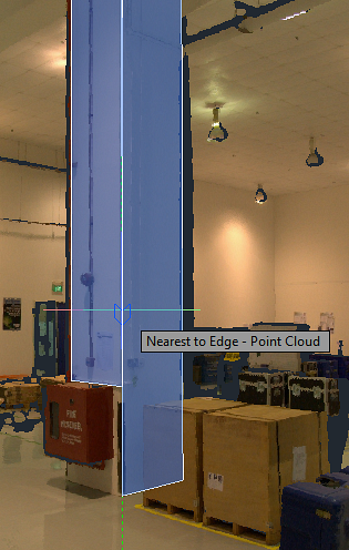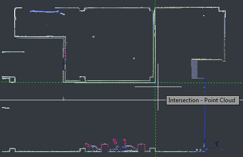 - Snaps to the intersection of inferred section lines for point clouds segments that are sliced with a section plane object Zooming in increases the accuracy of the intersection point.