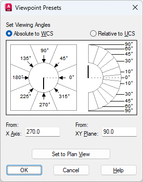 Sets the viewing angles to display the plan view (XY plane) relative to the selected coordinate system.