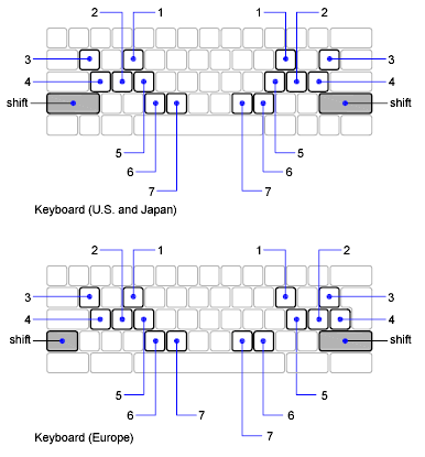 The keys in the following illustration are the default keys, but you can change key assignments and add your own as needed.