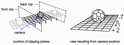 You can clip the views of your drawing by positioning front and back clipping planes that control the visibility of objects based on their distance from a theoretical camera. You can move the clipping planes perpendicular to the line of sight between the camera and target (where the camera is pointing). Clipping removes the display of objects from the front and back of clipping planes. The following illustration shows how clipping planes work: