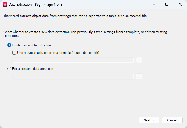 Creates a new data extraction and saves it to a DXEX file. You can also specify a previous extraction file (BLK, DXE, or DXEX) to use as a template file.