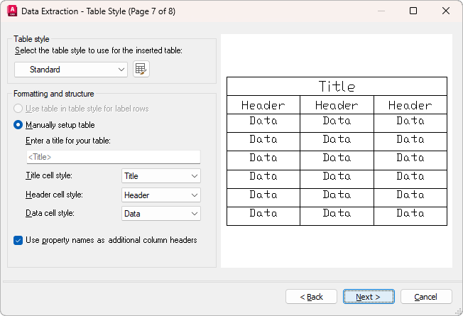 Controls the appearance of the data extraction table. This page is displayed only if AutoCAD Table is selected on the Choose Output page.