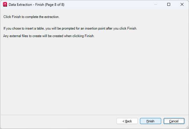 Creates a table that is populated with extracted data. You are prompted to insert the table into the current drawing when you click Finish on the Finish page.