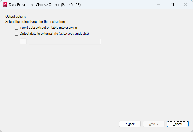 Creates a data extraction file. Click the [...] button to select the file format in a standard file selection dialog box. Available file formats are Microsoft Excel (XLSX), comma-separated file format (CSV), Microsoft Access (MDB), and tab-separated file format (TXT). The external file is created when you click Finish on the Finish page.