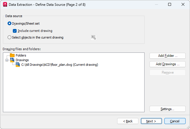 Specifies the drawing files, including folders from which to extract data. Allows selection of objects in the current drawing from which to extract information.