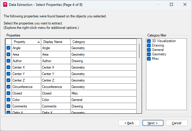 Displays a list of categories that are extracted from the property list. Unchecked categories filter the Properties list. Categories include 3D Visualization, Attribute, Drawing, Dynamic Block, General, Geometry, Misc, Pattern, Table, and Text.