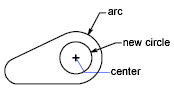 The following example uses rad with the CIRCLE command. The radius of the new circle is two-thirds of the radius of the selected polyline arc segment: