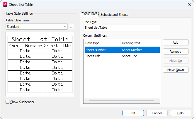 When checked, displays the names of the subsets, dividing the sheet list table into sections.