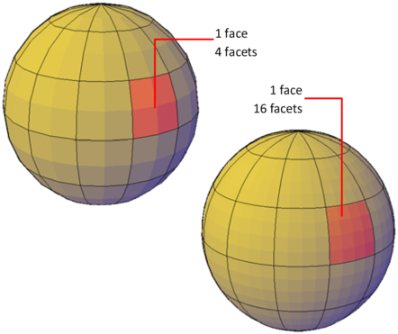 Mesh faces have underlying structures, known as facets. The density of the facet grid corresponds to the smoothness of the mesh. As the smoothness level is increased, the density of the underlying facet grid also increases. When you want to confine detailed mesh editing to a smaller area, you can convert facets to editable faces by using refinement.