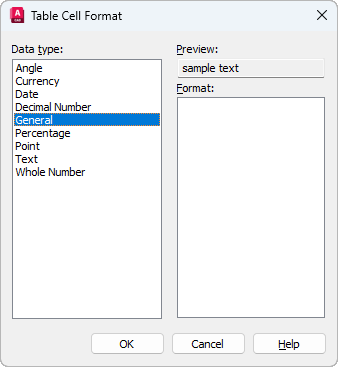 Depending on the data type you select, displays a list of relevant format types. For example, if you selected Angle as the data type, options such as Decimal Degrees, Grads, Radians, and so on are displayed.
