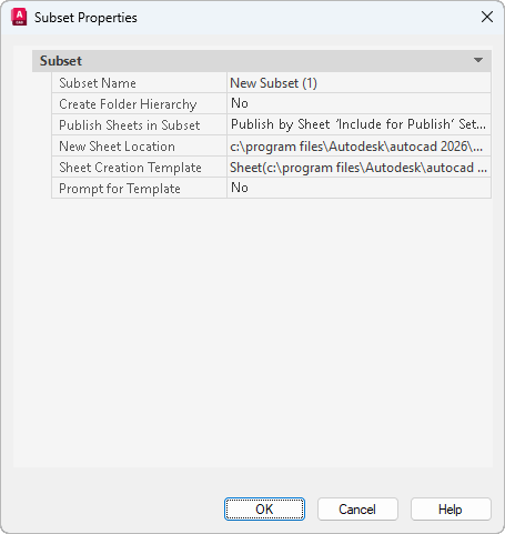Specifies the drawing template (DWT) file and layout name that is used to create new drawing files for this subset.