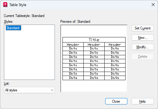 Deletes the table style selected in the Styles list. A style that is being used in the drawing cannot be deleted.
