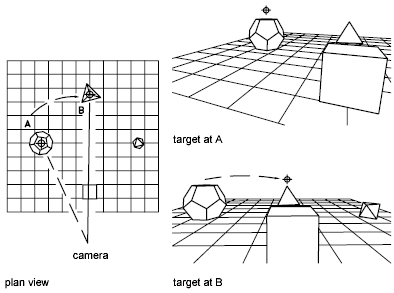 A rubber-band line connects the target point to the crosshairs to help you place the camera relative to the target. The illustration shows the change in view as you swap the camera and target points. Lens and distance settings are the same in each case.
